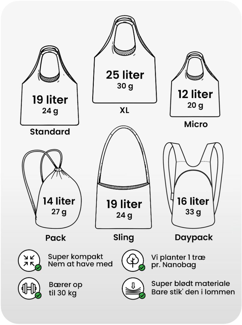 Nanobags er ultralette premiumtasker designet til at være med overalt. De fylder næsten ingenting i lommen, men er altid klar, når du har brug for dem. Fra træning og indkøb til rejser gør Nanobag det nemt at være forberedt.