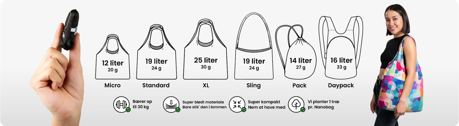 Vi har ét mål: at lave de mest ultralette og praktiske tasker på markedet. Nanobag vejer kun 20–33 gram og er designet til at være mikroskopisk i lommen, men overraskende stærk i brug. Sammen med vores community har vi allerede solgt over 200.000 tasker på Kickstarter, Amazon, vores webshop og i udvalgte butikker.