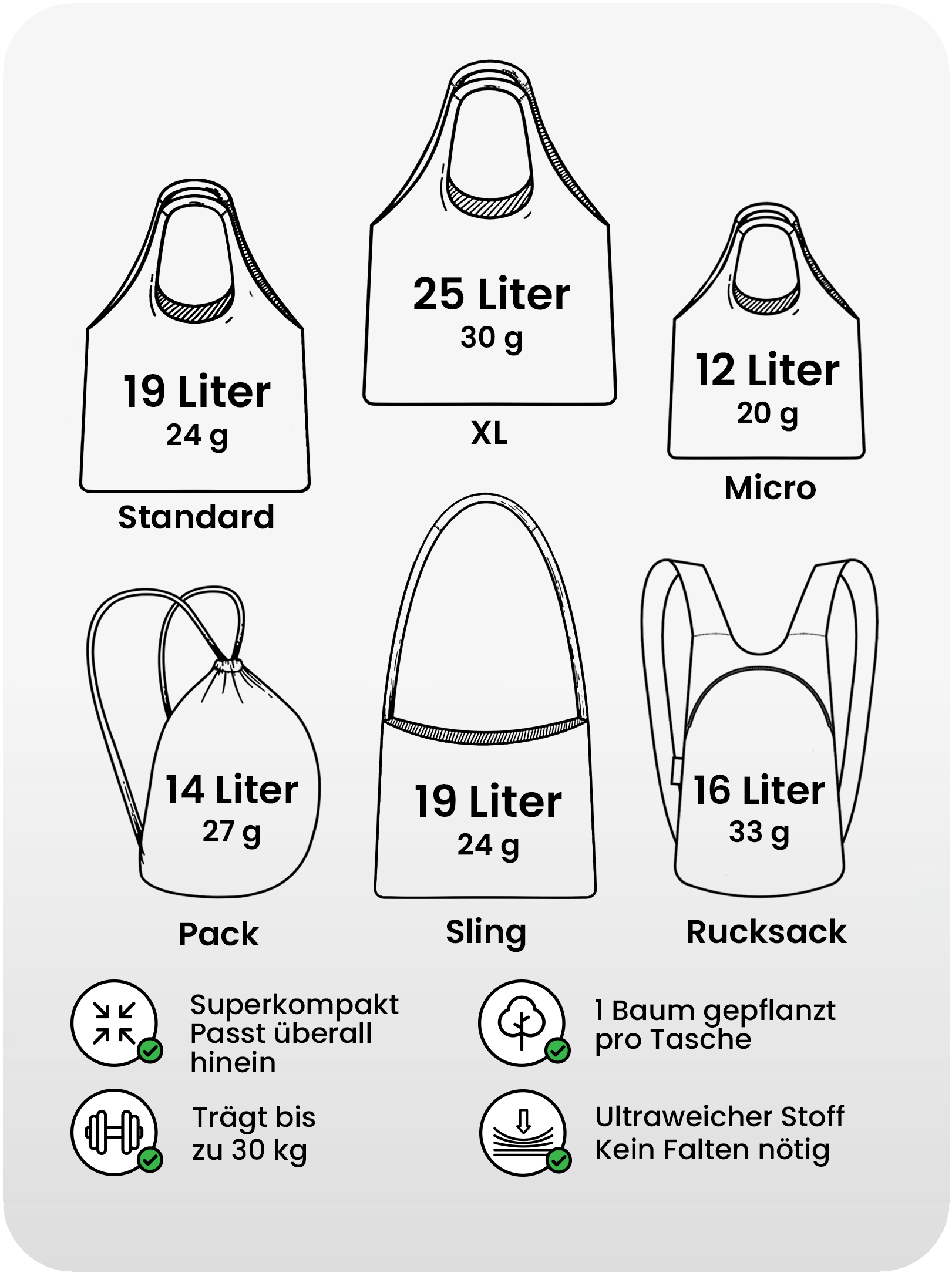 Nanobags sind Premium-Taschen, so kompakt, dass du sie kaum bemerkst. Sie verschwinden nicht nur praktisch in deiner Hosentasche, sondern sind in verschiedenen Modellen erhältlich, die auf unterschiedliche Bedürfnisse zugeschnitten sind. Ob im Fitnessstudio, beim Einkaufen oder auf Reisen – Nanobags bereiten dich mühelos auf jede Situation vor.
