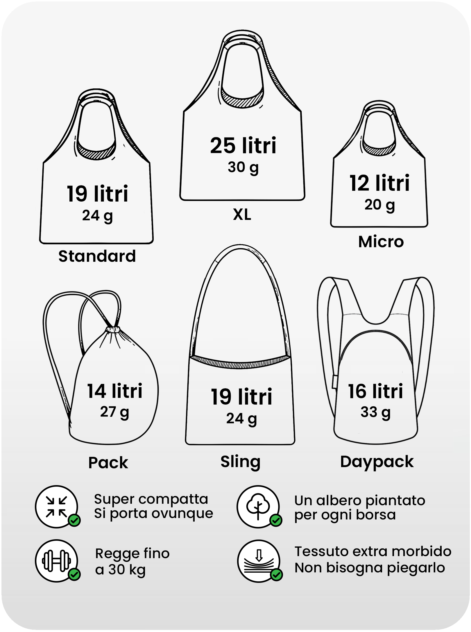 Le Nanobag sono borse premium così compatte che non ci si accorge di portarle. Non solo scompaiono in tasca, ma sono disponibili in diversi modelli per ogni esigenza. Che si sia in palestra, a fare shopping o in viaggio, le Nanobag si preparano con facilità a qualsiasi situazione.