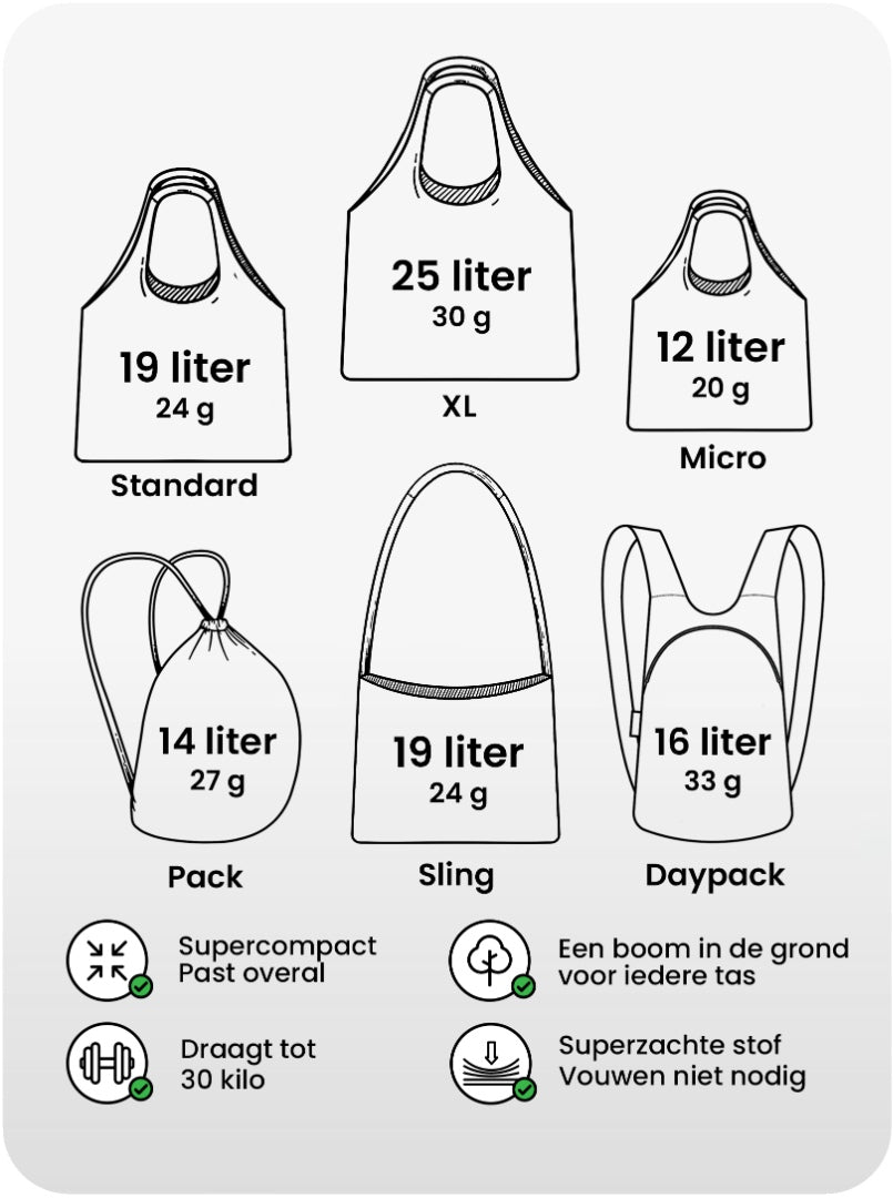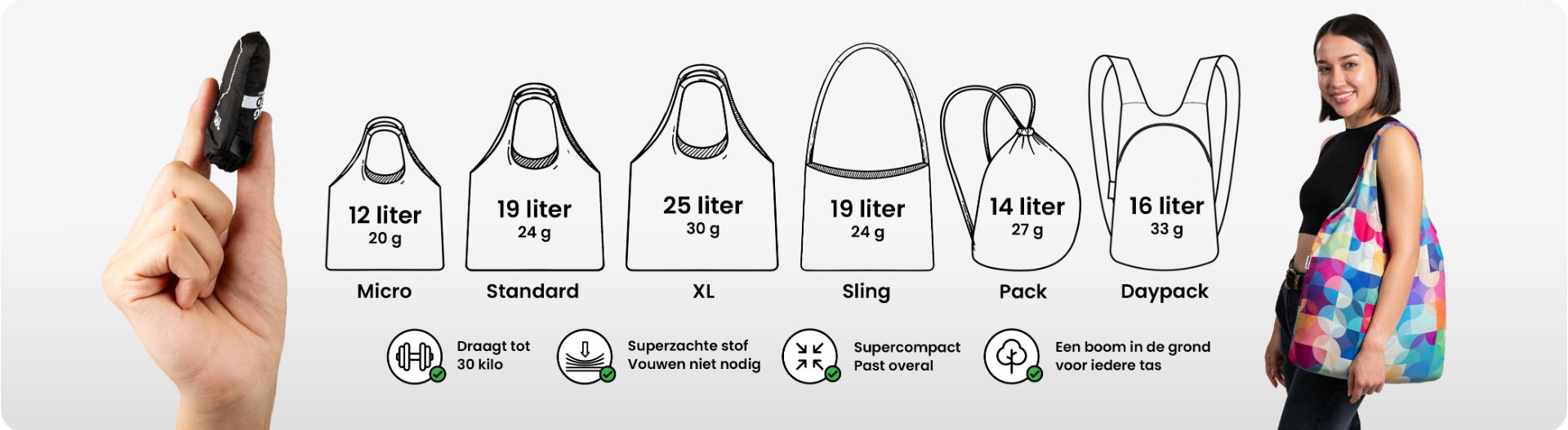 Nanobags zijn premium tassen zo compact dat je niet eens door hebt dat je het draagt. Niet alleen verdwijnen ze vrijwel in je zak, ze komen in verschillende modellen voor verschillende draagbehoeften. Of je nu aan het sporten, winkelen of op reis bent, met Nanobags ben je zonder moeite voor wat dan ook voorbereid.