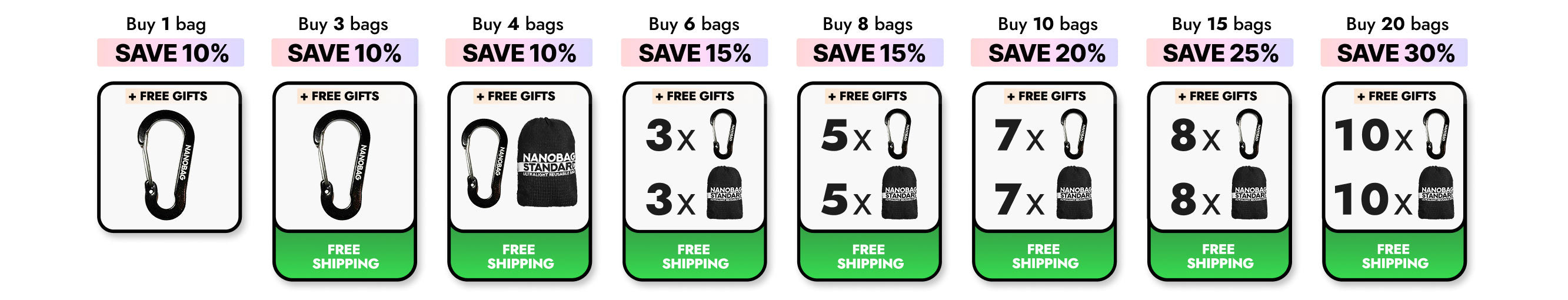 Weighing just 0.70 oz - 1.15oz, Nanobags redefine what true portability means, compact enough to disappear in your pocket, yet strong enough for everyday use. So far, our community has helped us raise over $2 million on Kickstarter and Indiegogo, bringing this vision to life.